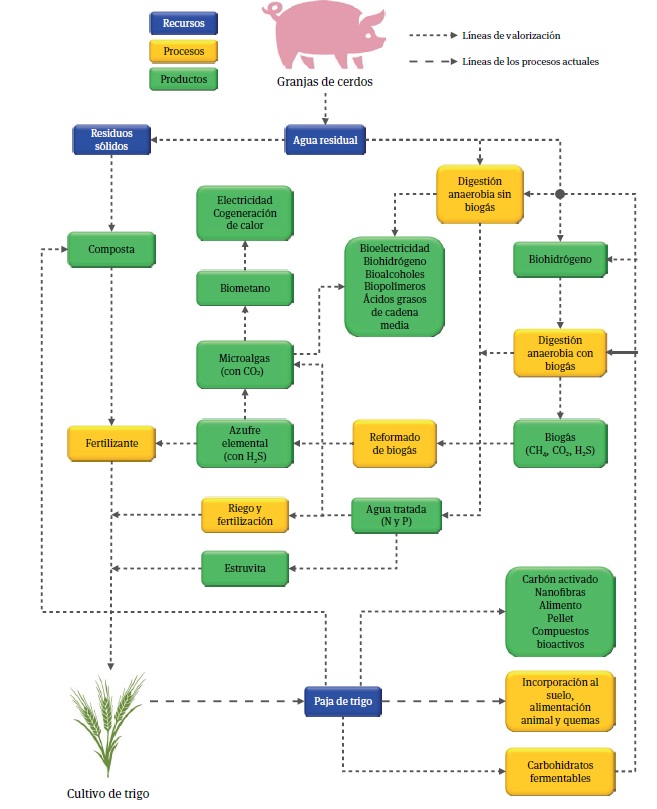 El presente estudio contiene propuestas destinadas al manejo de los residuos generados en granjas porcinas y cultivos de trigo (figura 7). Las estrategias planteadas pueden permitir la disminución de contaminantes de estos sectores productivos, los cuales normalmente son descargados al suelo, el agua y el aire, afectando en distintos grados los ambientes naturales. Además, dichas estrategias no sólo son un mecanismo para contrarrestar la contaminación, sino que representan un área de oportunidad para manejar y valorizar los residuos agropecuarios. Las estrategias mostradas en el presente trabajo pueden permitir la generación de energía, recuperar nutrientes y obtener productos de alto valor, a través de la interacción de los biosistemas pecuario-agrícola, tal como las granjas porcinas y cultivos de trigo.