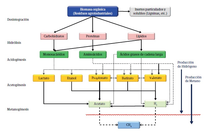 Nota: para favorecer la producción de hidrógeno en lugar de la producción de metano será necesario suprimir la última etapa del proceso (metanogénesis).