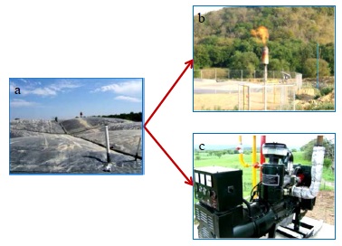 Nota: a) que permite la recuperación de biogás a partir de los procesos de digestión anaerobia en una laguna de oxidación. El biogás puede ser conducido a un b) quemador o a un c) motogenerador de electricidad.