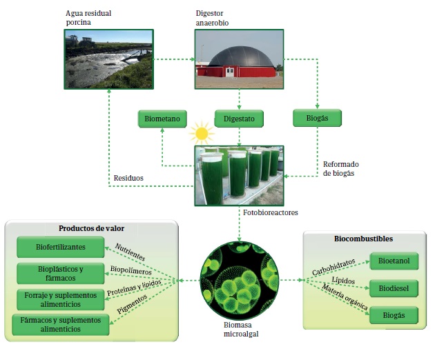 De manera paralela al reformado de biogás es posible producir biomasa microalgal. Actualmente las microalgas son consideradas una materia prima atractiva para obtener biocombustibles y productos químicos diversos a través de procesos de biorefinería, que incluyen el cultivo, cosecha, lisis celular y extracción de compuestos. El CO2 es utilizado por las microalgas como fuente de carbono, requieren periodos de luz y oscuridad para su crecimiento. Las microalgas producidas representan a su vez un potencial grande para generar distintos productos como los señalados previamente en la sección Digestión anaerobia sin biogás, pero también otros compuestos como pigmentos, lípidos, proteínas, carbohidratos, biopolímeros y compuestos bioactivos son susceptibles de obtenerse. La figura 5 presenta un esquema global de los procesos involucrados en el cultivo de microalgas a partir de la digestión anaerobia, con y sin biogás, de los efluentes porcinos.