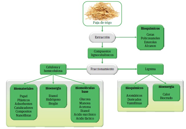 La lista de materiales susceptibles de producirse a partir de paja de trigo es amplia, con aplicaciones diversas y con importante demanda actual. Algunos productos de alto valor que se pueden extraer son ceras, policosanoles, esteroles y alcanos (Clark et al., 2006). A partir del fraccionamiento de la paja de trigo se pueden obtener los siguientes productos: