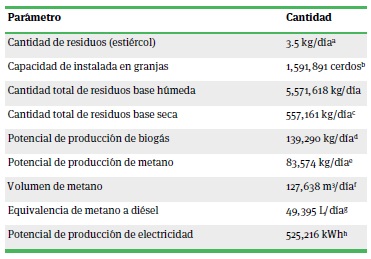 Fuente: adaptado de Sagarpa (2007, pp. 24-26).Anteriormente se mencionó que el hidrógeno tiene un contenido energético mayor al del metano, por lo que una estrategia valiosa para recuperar una mayor cantidad de energía puede ser un proceso en dos etapas: a) producción de hidrógeno y generación de los productos de la etapa acidogénica vía fermentación oscura; y b) utilización de los productos de la fermentación oscura para la producción de biogás (CH4, CO2 y H2S). Estas dos etapas se plasman en la figura 3. Separar el proceso en dos etapas permite que el hidrógeno sea recuperado antes de que sea utilizado por las bacterias metanogénicas. El potencial energético contenido en los residuos porcinos, en función de la cantidad de metano que se puede obtener, es sumamente grande. La tabla 2 muestra valores que nos dan una idea general del potencial energético actual de los residuos sólo en Sonora.