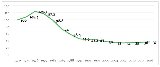 Unfortunately, the most critical issue in the informal job sector is the low wages. The Consejo Nacional de Evaluación de la Política de Desarrollo Social (Coneval), the organization responsible for measuring poverty, uses two lines of income: the Extreme Poverty line for Income and the Income Poverty Line. In August 2018, when this current research was carried out, the first line was $1,516.63 Mexican pesos and the second line was $3,001.17 Mexican pesos. Chart 1 shows that since the mid-1970s, the average minimum wage has suffered a sharp decline in real terms and is now (Samaniego, 2018) among the lowest in Latin America.12