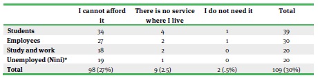Apart from that, in spite of being the organization in charge of enforcing justice in the telecommunications sector, the ift is not part of the judicial authority but is supposed to be an autonomous body, and this has resulted in Telmex still being the predominant player and in limited affordability of and accessibility to internet service.8 As a matter of fact, 27 % of the interviewees stated that they did not have internet at home because they could not afford it, and most of them were students and/or employees (seetable 1); a marginal 2.5 % stated that there was no service where they lived and 5 % stated that they did not need it.