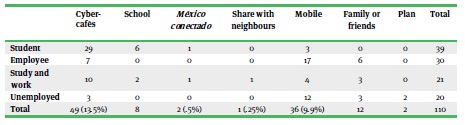 Most of those who did not have internet at home went to cyber-cafés to access it (13.5 %), mainly students, as shown in table 2. Surprisingly, only 5 % of the interviewees went to Mexico-conectado zones, which was one of the main policies of the government to guarantee the constitutional right of access to the internet and close the digital divide between 2013 and 2018. To achieve this goal, México Conectado deployed telecommunications networks which provide connectivity in public places such as schools, health centres, libraries, community centres and parks.