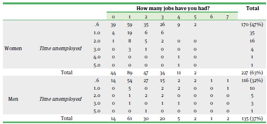 Table 3 shows that of the 362 interviewees, 195 (54 %) had a job, most of them (161 or 44.5 %) in the service sector, 32 (9 %) in the industrial sector and two (5 %) in the government. However, only 23 (6 %) had access to unions in both the industrial and the service sectors. As seen in table 4, most of the women had had between one and three jobs and had been unemployed for less than six months. Surprisingly, the case of men is more or less similar since most of them had also had between one and three jobs and have been less than six months unemployed. The reasons for this have to do not only with weak law enforcement and unionism but also with their labour skills and job conditions, as we shall see in the following sections.