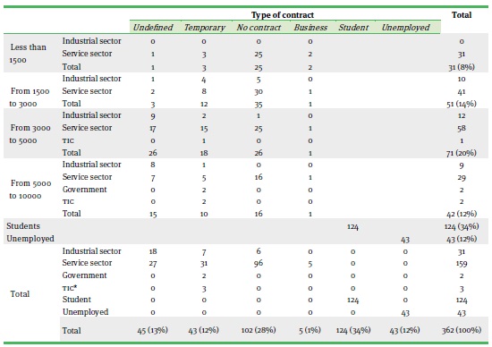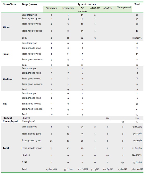 According to Moreno-Brid et al., (2018), between 2013 and 2018 around 4.6 million formal jobs were created, but most of them were precarious jobs and had low wages. Table 7 shows that of the 362 interviewees, 28 % were employed but had no contract, 12 % had a temporary contract and only 12.5 % had a fixed or undefined contract; the rest had a business (1.5 %), were full-time students (34 %) or were unemployed (12 %).
