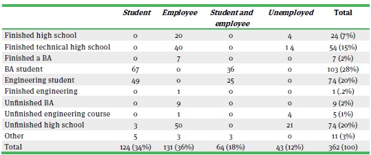 As shown in table 6, of the 362 interviewees, only eight (2 %) had completed either a Bachelor of the Arts (ba) or an engineering degree, 32 % were studying either a ba or an engineering course, 34 % were employed without having finished a ba or an engineering course, 18 % were studying either a ba or an engineering course and working at the same time, and 12 % were neither studying nor working.