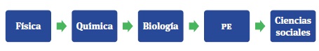En contra de estos dispositivos de dominio general la pe defiende, como he señalado anteriormente, dispositivos de “dominio específico, innatos y que además son producto de la evolución por selección natural” (García, 2010, p. 17), es decir, los módulos darwinianos. Debido a que dichos dispositivos -según sus defensores- son producto biológico y la pe es un acercamiento a la psicología fundado en la biología evolutiva, entonces Cosmides y Tooby (1992; 1997) afirman que la pe crea un puente teórico con las ciencias naturales. Para ellos la física fundamenta a la química, la química a la biología y la pe está fundamentada por la biología. Pero la cadena no termina ahí, al momento en que los defensores de la pe hablan de los mecanismos de la mente, que son esenciales para la socialización y en general para la emergencia de la cultura, consideran que la pe fundamenta el resto de las ciencias sociales. La idea se podría representar esquemáticamente como se muestra en la gráfica 1.