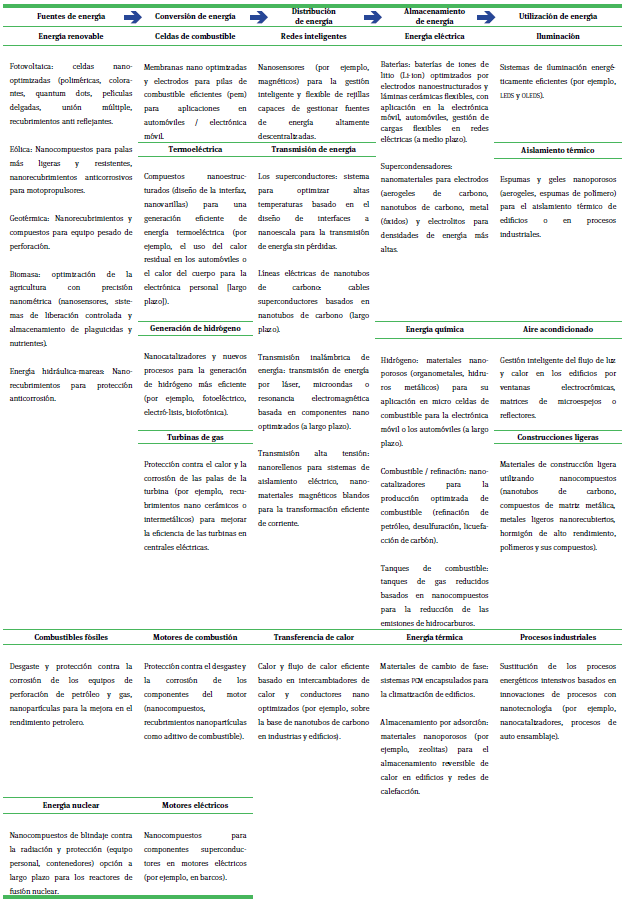Las nanotecnologías poseen la capacidad de insertarse en todas las fases de la cadena de suministro energético, desde la fuente primaria, atravesando la captación, la conversión, la distribución, el almacenamiento, hasta llegar a su uso final (figura 1). Estas aplicaciones pueden implementarse de manera simultánea o en combinación. Prueba de ello radica en la diversidad de productos que actualmente podemos encontrar en el mercado internacional y que ilustran la evolución de las nanotecnologías en este sector. Empresas como Evonik Industries, Envia Systems y Nexeon han desarrollado baterías nanohabilitadas; Bing Energy produce celdas de combustible; Baker Hughes y fts International desarrollan productos para combustibles fósiles, y Asahi Glass, cima Nanotech, Magnolia Solar y CentroSolar Glas realizan celdas solares nanohabilitadas (Nanowerk, 2019).