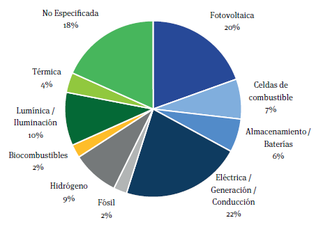 Los datos obtenidos se organizaron de acuerdo con el potencial de aplicación descrito en la figura 1: “fotovoltaica”, “celdas de combustible”; “almacenamiento / baterías”; “electricidad (generación / conducción)”; “fósil”; “hidrógeno”; “hidráulica”; “térmica”; “lumínica” y “eólica”. Además, se agregaron las categorías de “biocombustibles” y “no especificada”. 6