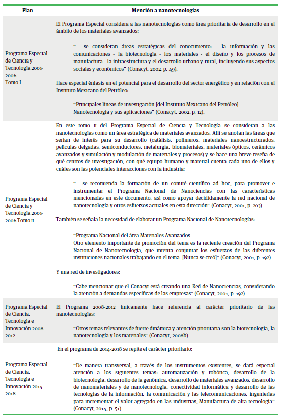 México, después de Brasil, participa de manera importante en el desarrollo de nanotecnologías en América Latina, según publicaciones científicas, patentes, infraestructura y recursos humanos (Foladori, Invernizzi, y Záyago-Lau, 2012; Záyago, Foladori, Appelbaum, y Arteaga, 2013). Sin embargo, México no cuenta con una estrategia o iniciativa nacional que establezca rutas de acción, áreas prioritarias, esquemas de vinculación (investigación- producción). Tampoco se tiene una cifra oficial del financiamiento público otorgado a este paquete tecnológico; mucho menos existe un desglose de los recursos ejercidos por áreas específicas. Lo más próximo a una política pública específica es lo contenido en el Programa Especial de Ciencia y Tecnología e Innovación (peciti [antes pecyt]) (tabla 1).