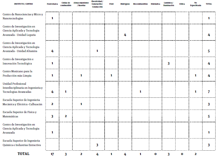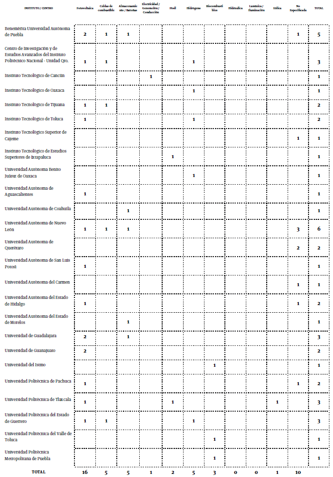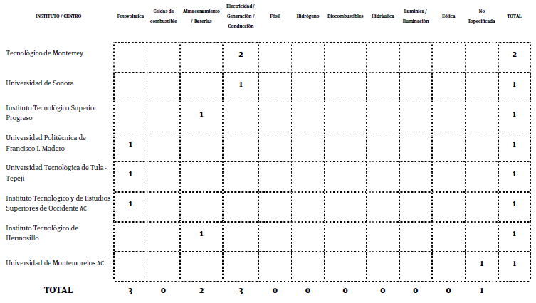 Se encontraron 37 proyectos de investigación. La energía fotovoltaica, concentra la mayor parte, con 17 proyectos (45.9 %). Le siguen las tecnologías de hidrógeno y electricidad /generación /conducción, con cuatro cada una (10.8 %); celdas de combustible y lumínica / Iluminación, tres respectivamente (8.1 %); almacenamiento/baterías, dos (5.4 %), y energía fósil, biocombustibles y eólica, uno respectivamente (2.7 %). Únicamente en dos proyectos no se especificó una categoría (5.4 %).