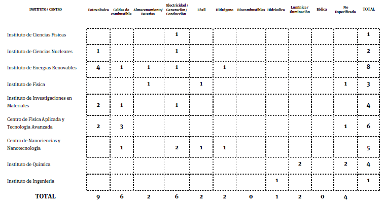 El Instituto de Energías Renovables (ier) cuenta con ocho proyectos; el Centro de Física Aplicada y Tecnología Avanzada (cfata), seis; el Centro de Nanociencias y Nanotecnología (cnyn), cinco; el Instituto de Investigaciones en Materiales (iim) Instituto de Química (iq), (4); Instituto de Física (if), tres; Instituto de Ciencias Nucleares (icn), dos; Instituto de Ciencias Físicas (icf) e Instituto de Ingeniería (II), uno cada uno.