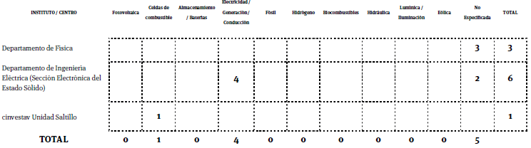 En el caso del Cinvestav (tabla 5), hay 10 proyectos de investigación sobre el tema. En la mitad de los proyectos no se especifica su área de aplicación. Existen cuatro proyectos de energía eléctrica, en el Departamento de Ingeniería Eléctrica (Sección Electrónica del Estado Sólido), y un proyecto para celdas de combustible en la Unidad Saltillo.