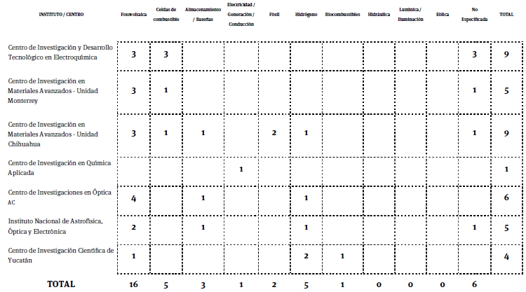 El Cimav lidera la investigación en el tema, al concentrar 14 proyectos, nueve en la Unidad Chihuahua y cinco en la Unidad Monterrey. Le siguen el Centro de Investigación y Desarrollo Tecnológico en Electroquímica (Cideteq), nueve; el Centro de Investigaciones en Óptica ac (cio), seis; el Instituto Nacional de Astrofísica, Óptica y Electrónica (inaoe), cinco; el Centro de Investigación Científica de Yucatán (cicy), cuatro; y el Centro de Investigación en Química Aplicada (ciqa), un proyecto.