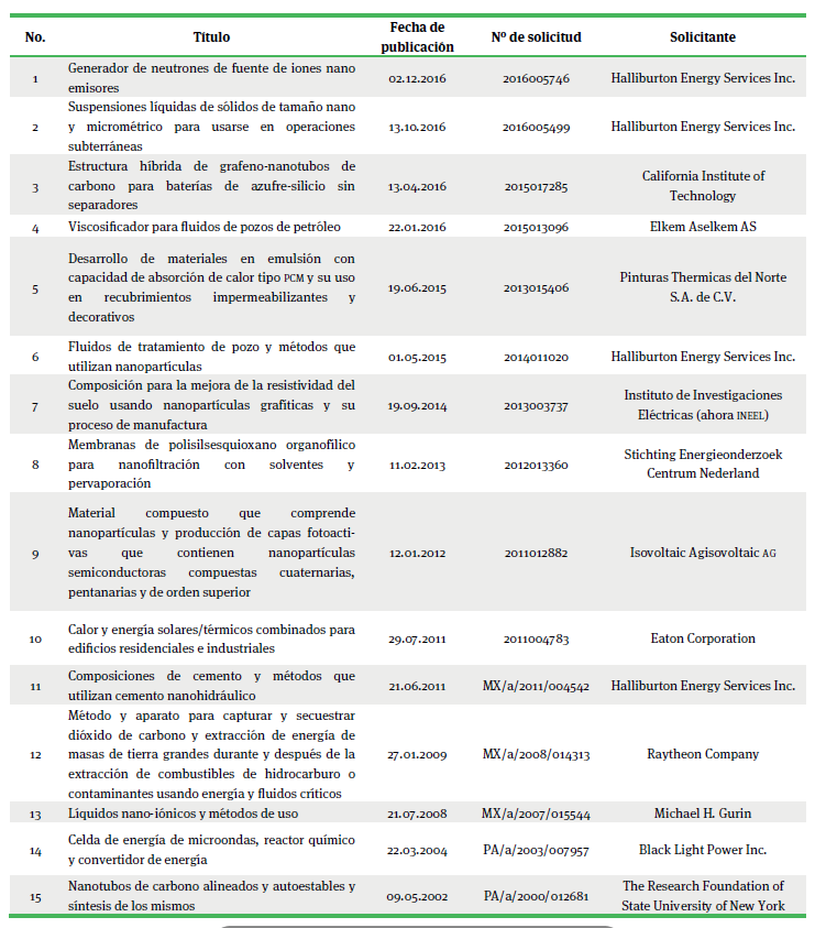 Se consultaron las bases de datos de patentes de la World Intellectual Property Organization (wipo),9para encontrar las concernientes a la aplicación de nanotecnologías en el sector energético y otorgadas en México. Se encontraron 133 patentes y se descartaron aquellas que no tuvieran relación directa o explícita con aplicaciones de nanotecnologías en energía. Los resultados arrojaron 15 patentes entre 2002 y 2016. La tabla 8 muestra los registros por título, número de solicitud y empresa o inventor solicitante.