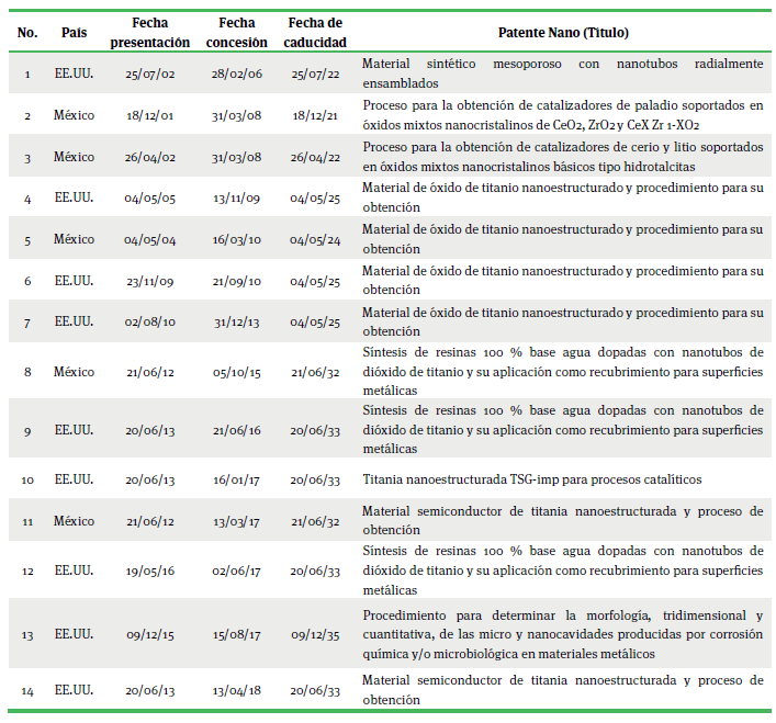 Se consultaron también las patentes del Instituto Mexicano del Petróleo.10 Se encontraron 1 042 patentes para el periodo de entre 1967 y 2014; la primera patente de nanotecnología se presentó en 2002 y se reconoció en 2006. Después de filtrar aquellas que fuesen exclusivamente de nanotecnologías, se encontraron 14 sobre energía, las cuales fueron concedidas entre 2006 y 2018. La tabla 9 presenta los resultados por fecha de presentación, de concesión y de caducidad, así como el título de la patente. El ineel y el inin no tienen patentes de nanotecnologías aplicadas a la energía en sus portales de información.