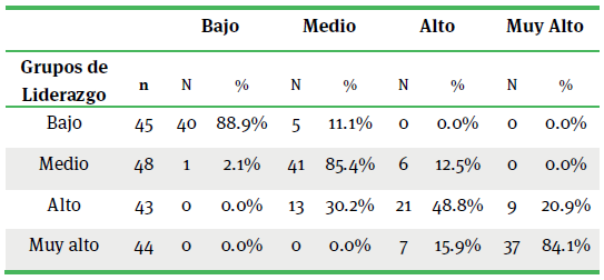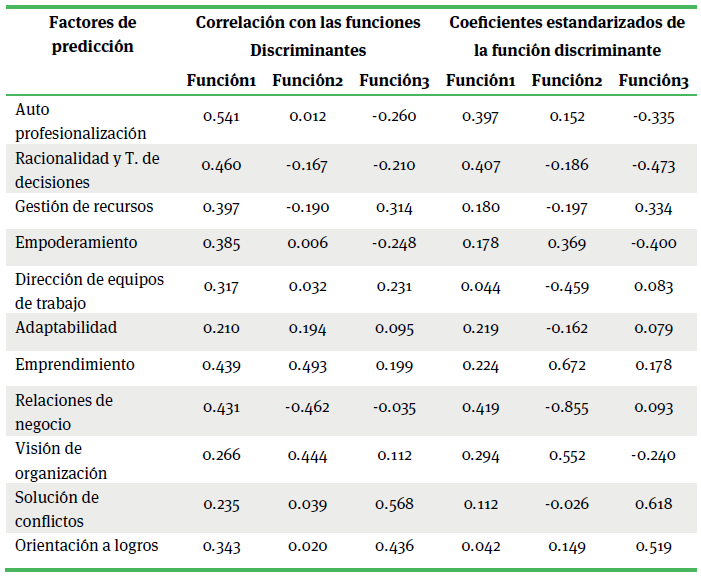 Las funciones 1 y 2 discriminantes, son perfiles de puntuaciones medias de los 4 grupos de liderazgo, que explican 87% de la varianza con una correlación canónica de 0.878 y 11.9% con el 0.562 respectivamente. No obstante, la función 3 es la más alejada y cuantifica en menor medida las discrepancias, lo que supone una diferencia mayor en los factores predictivos con respecto al resto de los grupos. En cambio, sugiere menores disparidades entre estas, respecto al perfil de la función 2 (cuadro 8). Lo anterior, se reafirma por los valores de intercorrelación que definen a los diversos grupos de comparación.