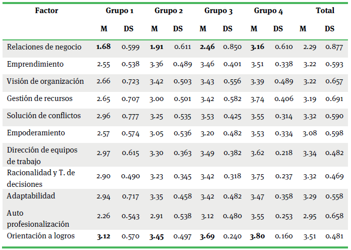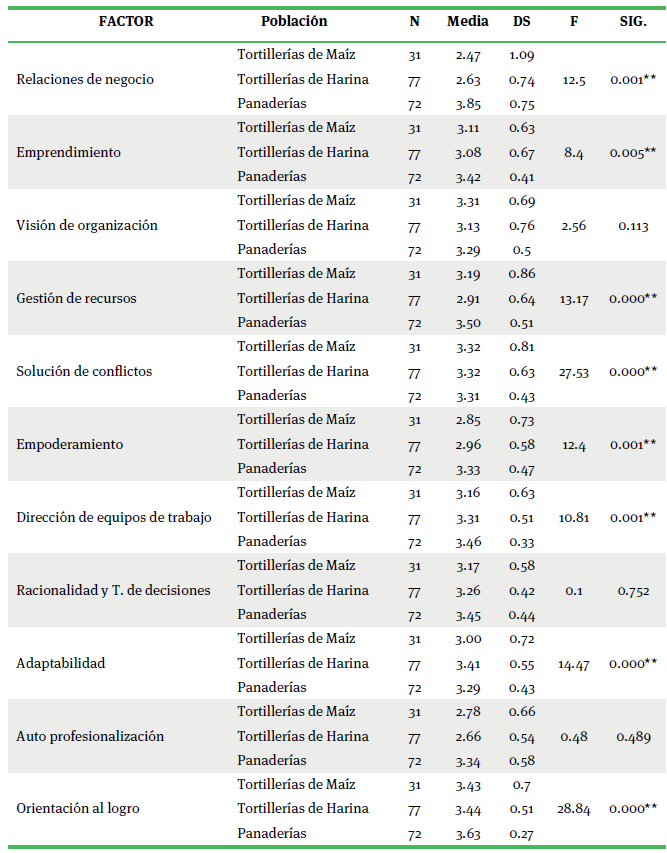 Finalmente, los resultados de la prueba t para muestras independientes, compararon las puntuaciones obtenidas de la nueva escala por giro de empresa o tipo de población, resultando éstos significativos estadísticamente p < 0.05 para los factores (cuadro 10): Relaciones de negocio, Emprendimiento, Gestión de recursos, Solución de conflictos, Empoderamiento, Dirección de equipos de trabajo, Adaptabilidad y orientación al logro, que va desde 0.000 a 0.005. Lo que demostró que, entre las poblaciones de tortillerías de maíz, tortillerías de harina y panaderías, existen diferencias en el nivel de los factores antes señalados. En tanto, para los factores: Visión de organización, Racionalidad y toma de decisiones y Auto profesionalización, resultó lo contrario.
