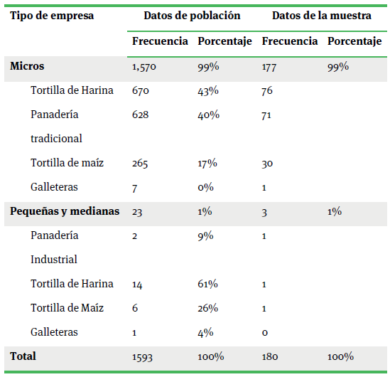 A través de un diseño no experimental de tipo descriptivo correlacional, el cual requiere aplicar la medida en un solo momento y, con ello, identificar el agrupamiento de los reactivos en factores (Kerllinger y Lee, 2002), se eligió un muestreo probabilístico y una muestra estratificada (Brewer y Hunter, 2006), por nivel de empresa (micro, pequeña y mediana) y giro (tortillerías de maíz, tortillerías de harina, panaderías y galleteras). Partiendo de un universo de 1593 establecimientos y sus diferentes estratos, se seleccionaron 180 micro, pequeñas y medianas empresas, representadas por igual número de participantes, con las siguientes características generales (cuadro 1).