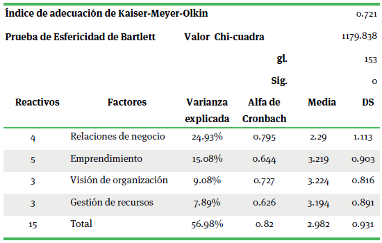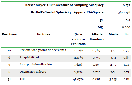La Dimensión de Liderazgo Personal reveló una estructura de 4 factores que explican el 47.08% de la varianza total. Esta dimensión mostró una alta consistencia interna con un Alfa de Cronbach de .882 (cuadro 4)