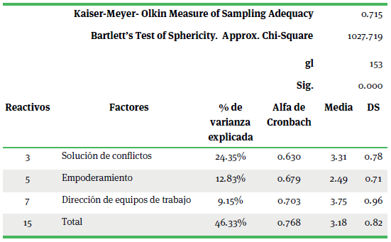 La Dimensión de Liderazgo Social mostró una estructura de 3 factores que explican el 46.33% de varianza total. Esta dimensión obtuvo una alta consistencia interna con un Alfa de Cronbach de .768 (cuadro 3).
