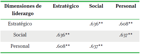 Las dimensiones de liderazgo mostraron valores de asociación positiva y de un nivel moderado, mostrados en el cuadro 5.