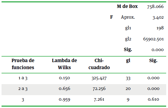 El resultado de M. de Box= 758.066 comprobó la igualdad de las matrices de covarianzas entre los grupos, con una alta significancia (P=.000). El Lambda Wilks corroboró diferencias importantes entre la primera y tercera función (0.150), pocas diferencias entre la segunda y tercera (0.656), con altos niveles de significancia para ambas funciones (P=.000). En tanto para la tercera función reveló que las diferencias no son importantes (cuadro 6).