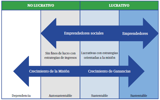 Un modelo permite diferenciar los planteamientos de las escuelas de pensamiento en la práctica y analizar sus elementos para contrastarlos entre sí. Existen diferentes modelos que buscan explicar a los emprendimientos sociales. Abu-Saifan (2012) realiza una diferenciación de los tipos de organizaciones existentes considerando su orientación a la generación de utilidades; la esencia de su modelo radica en explicar la existencia de empresas híbridas que se encuentran en un punto intermedio entre la empresa tradicional y las organizaciones no lucrativas (figura 1).