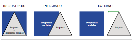 La integración muestra la relación que tiene la empresa con el grupo beneficiario y su incorporación dentro de su estructura y estrategia de negocios. En la etapa externa la relación es unilateral, enmarcada por lo regular dentro de la filantropía, la empresa figura como un actor donante caritativo y otro destinatario, no cuenta con estrategias integradas o funciones de gestión, cualquier cambio en la estrategia de empresa podría cambiar sus programas sociales. En la etapa integrada el flujo de beneficios se vuelve bilateral a medida que se intercambian recursos y el aprendizaje se vuelve mutuo; por lo regular tiende a mantener una doble estrategia que permite obtener fondos para sustentar sus programas sociales. En la etapa incrustada los principios característicos de los dos enfoques de la empresa se fusionan a nivel de estrategia y ejecución, de modo que los programas sociales se gestionan con la eficiencia típica de las empresas privadas con visión de sostenibilidad, los proyectos están diseñados con responsabilidad y cuidado para los demás (Alter, 2007).