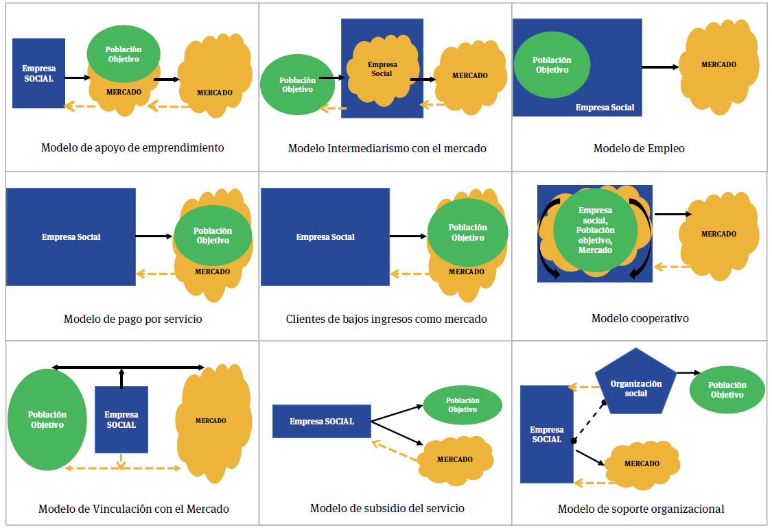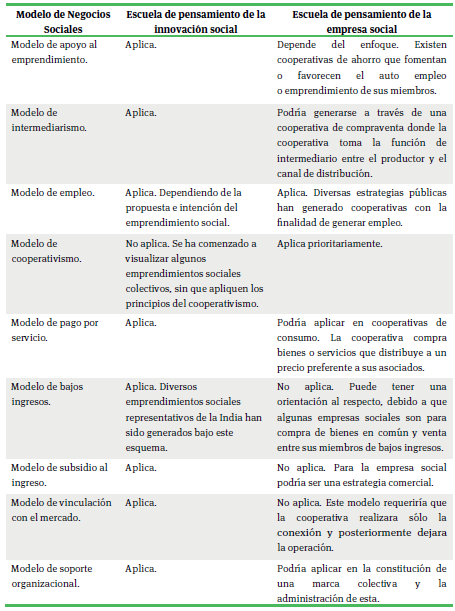 La empresa social presenta un modelo de negocios base, que es el modelo de cooperativismo, y en segundo nivel, pueden plantearse otros modelos relacionados; como podrían ser el modelo de generación de empleo, de intermediarismo, de soporte organizacional y de generación de emprendimientos. En el caso de la escuela de innovación social se podría decir que es más flexible y que podrían combinarse con mayor posibilidad diferentes modelos de negocio.