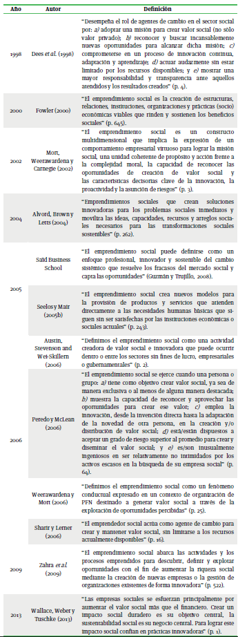 Para la integración de las definiciones del emprendimiento social se proponen aquellas que lo estudian como proceso, a partir de las cuales se identificarán elementos comunes (tabla 1).