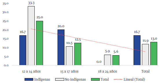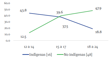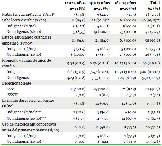 Fuente: elaboración propia.Algunas variables registraron una distribución significativamente diferente por grupos de edad, destacando que, aunque un elevado porcentaje de mujeres dijeron saber leer y escribir, el mayor porcentaje que dijeron no saber leer ni escribir se concentra en el grupo de 12 a 14 años (14.0%), sin diferencias por etnia (14.3% indígenas y 16.7% no indígenas). Un alto porcentaje de las mujeres de los tres grupos de edad se encontraba estudiando cuando ocurrió el embarazo (90.6%); en las menores de 18 años 16.0% no estaba estudiando y tampoco había asistido alguna vez a la escuela (tabla 1). La cifra de niñas y adolescentes que no estaban estudiando cuando se embarazaron fue mayor en las indígenas; no obstante, el nivel promedio de escolaridad alcanzado por indígenas fue mayor al de las no indígenas7 (tabla 1).