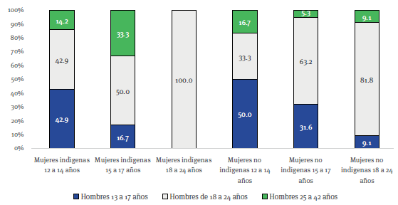 El deseo/aceptación del embarazo podría estar relacionada con la edad del padre biológico, por lo que se desagrega la edad del padre biológico según la edad de la madre en el primer embarazo. Destaca que el padre biológico del embarazo en niñas y adolescentes de 12 a 14 años, en un 42.2% fue un adolescente de 13 a 17 años (42.9% en indígenas y 50.0 en no indígenas [figura 1]). Es decir, que casi la mitad de los embarazos en niñas ocurren con un padre biológico también adolescente, lo que podría influir en la aceptación del embarazo y en el uso de servicios de salud durante el mismo, a la vez que establece una condición social de relación distinta a la que podría ocurrir entre menores de 15 años y hombres de mayor edad.