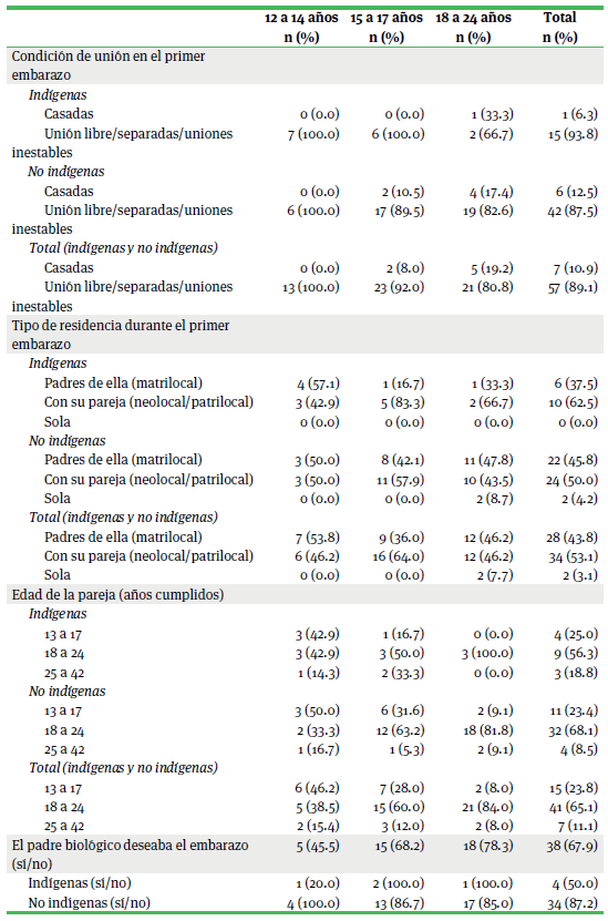 De los 64 primeros embarazos reportados por las mujeres incluidas en este estudio, 20.3% sucedieron en niñas de 12 a 14 años, entre quienes 53.8% fueron hablantes de alguna lengua indígena. Un alto porcentaje de las mujeres de los tres grupos de edad se encontraba estudiando cuando ocurrió el embarazo (90.6%). En las menores de 18 años aproximadamente 16.0% no estaba estudiando y tampoco habían asistido alguna vez a la escuela, a la vez que el embarazo en niñas menores de 15 años fue deseado por ocho a nueve de cada 10 mujeres no indígenas, mostrando la complejidad de la causalidad en la ocurrencia del embarazo precoz y la diversidad de circunstancias en las que ocurre, obligando a la búsqueda de estrategias gubernamentales específicas para erradicar el embarazo en niñas menores de 15 años.