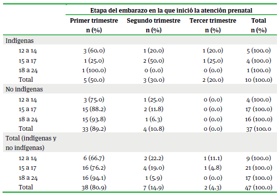 En la tabla 3 se presenta el trimestre de inicio de la atención prenatal por grupos de edad y adscripción étnica, confirmando la mayor desventaja en utilización de servicios de atención prenatal en las niñas de 12 a 14 y de adolescentes de 15 a 17 años.