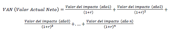 Habiendo realizado los cálculos de los cambios principales, tanto de los ingresos esperados, como de los costos incurridos, se obtuvieron dos indicadores que muestran el valor financiero de los costos y los beneficios sociales: el Valor Actual Neto (van) de los impactos (Ec.1); y el sroi. Para la estimación del van se procede a calcular los valores descontados de los ingresos totales menos los costos totales; que de acuerdo con Stern (2007) debe ser no menor al 3 %, durante un periodo de cinco años.