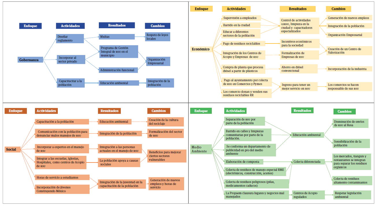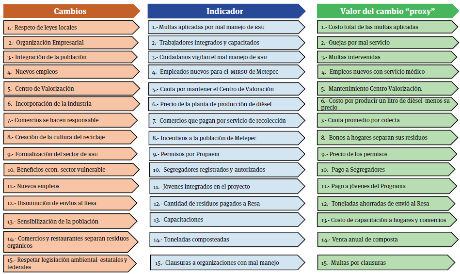 De acuerdo con las actividades y los resultados en el mapa de cambios se pueden destacar: respeto a leyes locales y ambientales, organización empresarial, integración de la población, generación de nuevos empleos, creación de un centro de valorización, incorporación de la industria, mayor responsabilidad del manejo de los residuos por parte de los comercios, creación de la cultura del reciclaje, formalización del sector, beneficios para mejorar ciertos sectores vulnerables, integración de la juventud, disminución de envíos de rsu al Resa, sensibilización de la población, los mercados, tianguis y restaurantes se integran para separar los residuos orgánicos y la colecta de residuos altamente contaminantes.