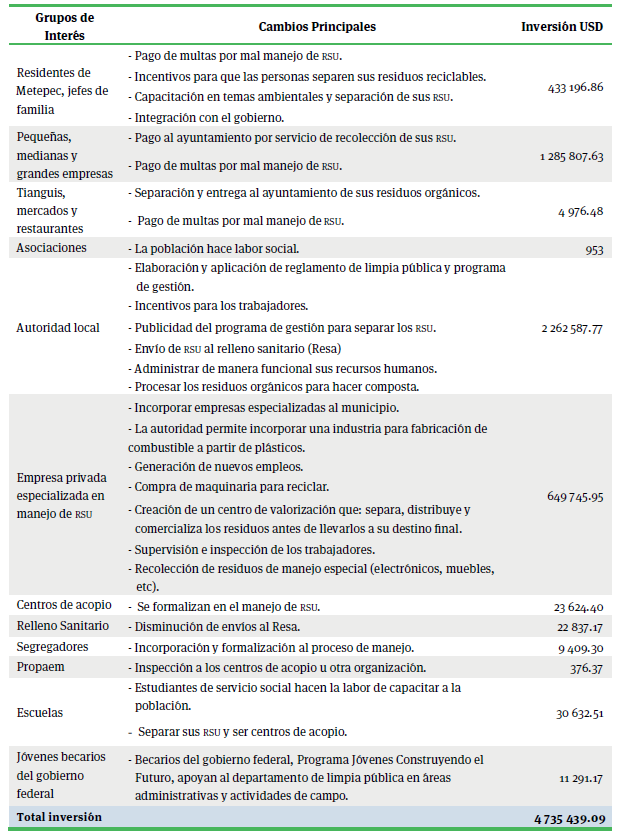 Para las dos primeras fases el cálculo de la inversión se monetizó gracias a la información que cada stakeholders compartió, resultando un total de 4 735 439.09 USD (tabla1), lo que representa las participaciones de todos los grupos de interés, para poder realizar el programa de limpia pública, donde la autoridad local invierte 47 %, los comercios grandes, medianos y pequeños 27 %, la empresa experta en rsu 14 %, y los residentes de Metepec 9 % (gráfica 1). Cabe distinguir que ciertos grupos de interés como el Resa, los centros de acopio y la Propaem no son exclusivos de Metepec, por lo que su inversión se dividió entre sus clientes potenciales.