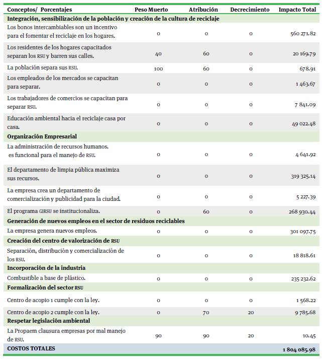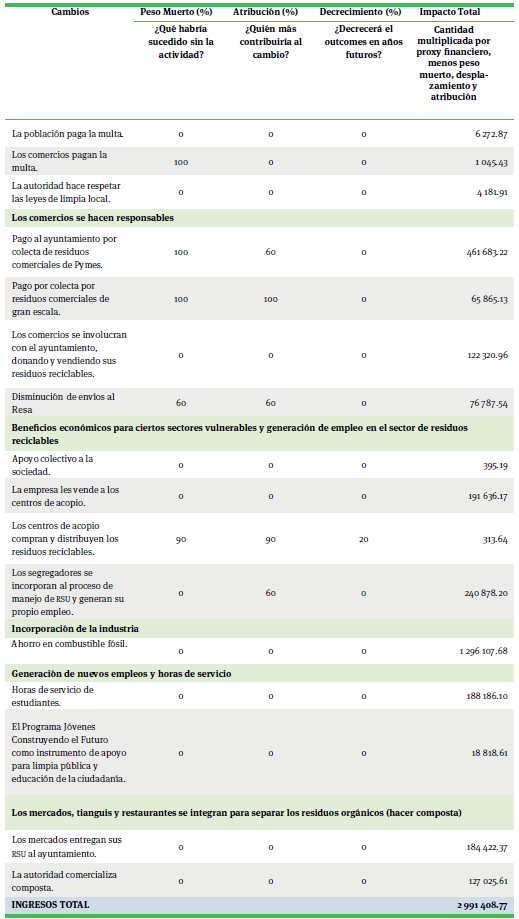 Los impactos sociales resultan de realizar una ponderación de los efectos de los cambios en los costos y los ingresos, a los que previamente se les asignó un valor extrafinanciero. Incluyendo también aquellos cambios que no necesariamente son atribuidos al programa de limpia pública del municipio; para ello se utilizaron los cuatro correctores propuestos por Nicholls et al. (2009), que permiten hacer una prospección a cinco años. Es importante hacer mención que estos valores fueron estimados con información recabada en las encuestas, las entrevistas y los talleres participativos de los stakeholders. Es sólo midiendo y contabilizando todos estos factores como se puede obtener un sentido del impacto que la actividad está teniendo. De lo contrario existe el riesgo de invertir en iniciativas que no funcionan.