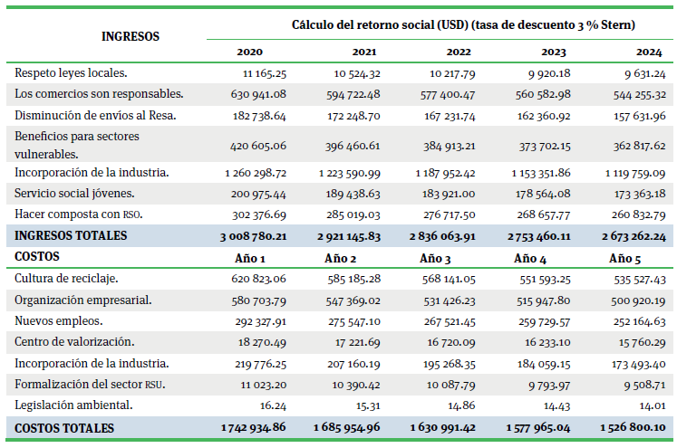 Una vez calculados los cambios principales, tanto de los ingresos totales 2 991 408.7 USD, como de los costos totales 1 804 085.9 USD, se realizó la proyección financiera para el periodo 2020-2024. En la tabla 4 se desglosan los ingresos y los costos de los principales cambios en un lapso de cinco años, con una tasa de descuento del 3 %, propuesta por el economista Nicholas Stern (Stern, 2007).
