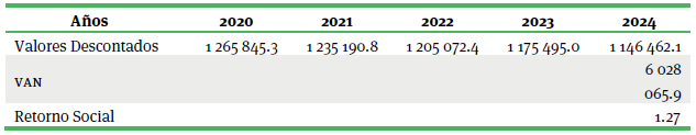 Como se muestra en la tabla 5 se obtuvieron los valores descontados de los ingresos totales menos los costos totales en cada año para obtener el van(Ec.1), resultando de 6 028 065.9 USD. Finalmente se obtuvo un sroi de 1.27, dividiendo el van entre la inversión total que fue de 4 735 439.1 USD (Ec.2).