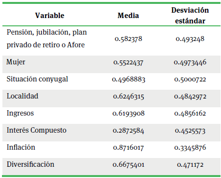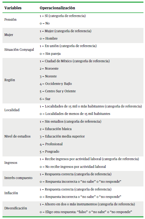 En este estudio todas las variables independientes proceden de los resultados de la enif 2018, y son las que a continuación se mencionan: género; estado civil; si los encuestados reciben ingresos por su actividad laboral; localidad y región en la que están asentadas las personas; y nivel de estudios. También se incluyeron las variables que, de acuerdo con Lusardi y Mitchell (2011b), conforman el conocimiento financiero: conocimiento sobre el interés compuesto y la inflación, además de la conveniencia de la diversificación de los canales de inversión.