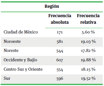 En la tabla 3 se muestra la distribución de los encuestados según la región que habitan. En el primer caso se observa que 19.88 % de las personas habitan en la región Occidente y Bajío, seguido de quienes viven en la región Sur (19.52 %).