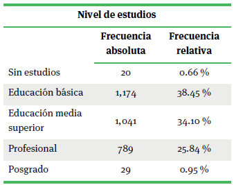 En cuanto al nivel de estudios de los encuestados, en la tabla 4 se muestra que la mayor parte han terminado únicamente la educación básica (38.45 %), seguido de quienes finalizaron la educación media superior (34.10 %). La menor frecuencia es de quienes no tiene estudios puesto que representan menos de 1 % de la muestra estudiada, así como de las personas que concluyeron estudios de posgrado.