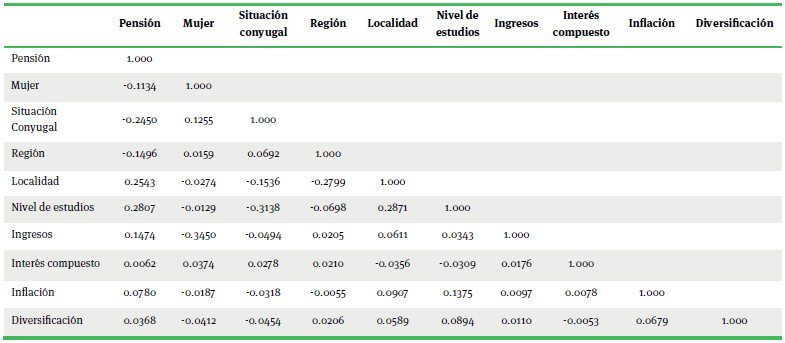 En la tabla 5 se expone el coeficiente de correlación bivariada de las variables que se estudian en este trabajo. Conforme a lo explicado por Anderson, Sweeney y Williams (2008), ese indicador muestra la intensidad de la relación lineal entre dos variables. El coeficiente de correlación puede tomar valores entre -1 y 1. Entre más cercano se encuentre a los valores extremos de ese intervalo, la intensidad de la relación lineal es más fuerte, pero si es cercano a 0, la intensidad de la relación es débil. La correlación positiva más alta es la que existe entre la pensión y el nivel de estudios con 0.2807, mientras que la correlación negativa más extrema se da entre la variable ingresos y el género.