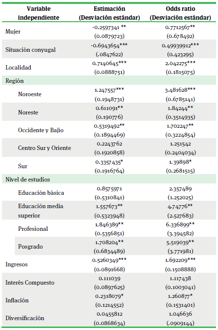 Las variables independientes que resultaron significativas en este modelo son el género, la situación conyugal, la localidad, todas las regiones (excepto el Centro Sur y Oriente) con respecto a la Ciudad de México, todos los niveles de estudio (a excepción de la educación básica) con respecto a las personas sin estudios, recibir ingresos por su actividad laboral y el conocimiento de la inflación. Las variables que tienen un efecto positivo sobre la probabilidad de que los jóvenes mexicanos prevean financiar su vejez mediante pensiones, jubilaciones o planes personales de retiro son todas las que resultaron significativas, a excepción del género y la situación conyugal, es decir, si se es mujer la probabilidad es menor que si se es hombre, sucede lo mismo para las personas que están casadas o en unión libre que si fueran viudos, divorciados, solteros o separados. Los efectos más grandes sobre la variable dependiente son el nivel de estudios y la región que habitan los encuestados.