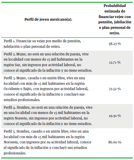 Conforme a los resultados mostrados en la tabla 7, se observa que aproximadamente el 58 % de los jóvenes mexicanos tiene planeado financiar su vejez por medio de pensión, jubilación o plan personal de retiro. Se obtuvieron las probabilidades de que los jóvenes esperen recibir una pensión previsional para financiar su vejez de cuatro perfiles específicos que incluyen el género, la región y el tamaño de localidad en que residen las personas, su situación conyugal, el nivel de estudios, el conocimiento de la inflación y recibir ingresos por actividad laboral.