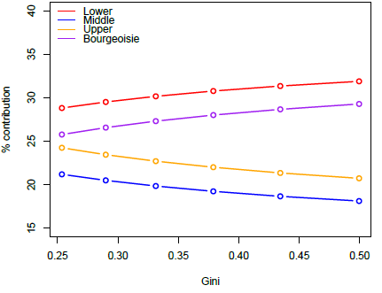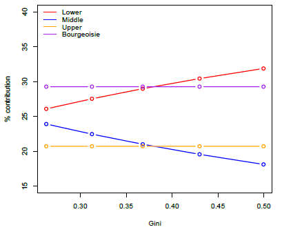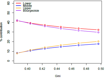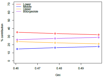Note that in this case and in comparison to the two previous cases, there is no crossing of lines in the graph, that is, in all the scenarios the order of percentage contribution of social classes to inequality is maintained: Lower, Bourgeoisie, Upper, and Middle.